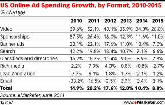 Courtesy eMarketer.com US Online Ad Spend Poised to Grow 20% in 2011 JUNE 8, 2011 Video remains fastest-growing format while search gains most new dollars Online ad spending is returning to pre-recession growth levels, with steady increases projected through 2015 as marketers continue to invest more in digital channels. eMarketer expects US online advertising spending […]